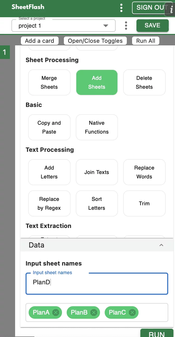 SheetFlash’s Add Sheets function allows users to efficiently insert multiple sheets into a workbook and it's incredibly intuitive. You can easily input the names of the sheets you want to add consecutively and add them all at once, making it extremely user-friendly and quick to use.