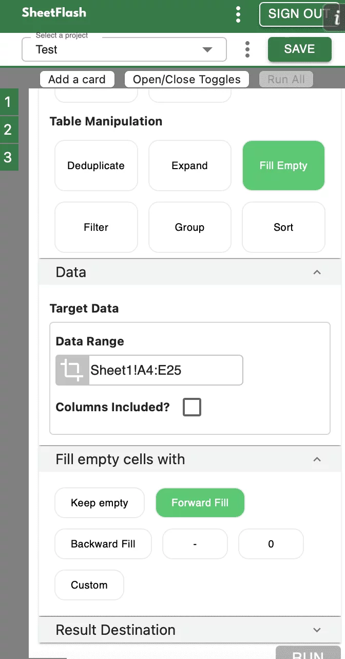 1. Using SheetFlash's Fill Empty Cells Function