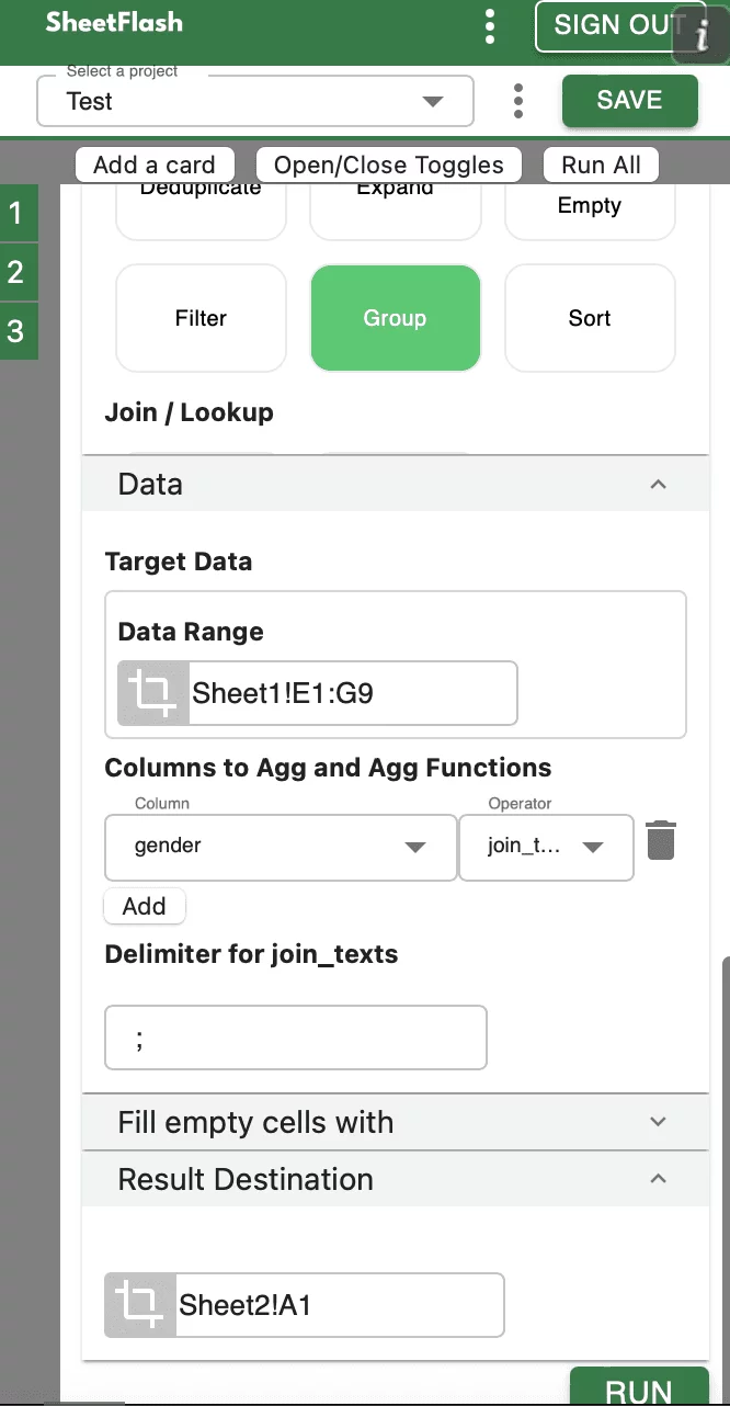 Advanced Grouping Capabilities: With SheetFlash’s group function, you can select columns and group data based on a chosen operator. For example, if you have columns for age, gender, and name, you can group names by the same age and gender using a delimiter.