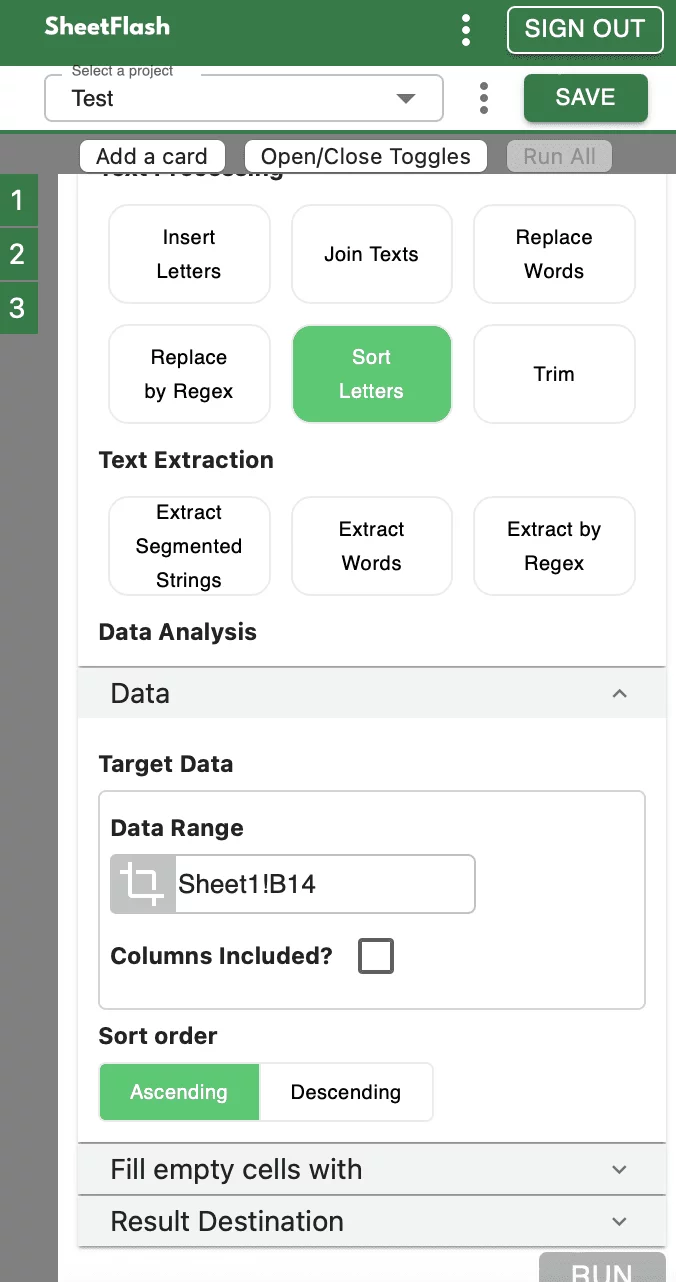 SheetFlash addresses all the challenges mentioned above. With SheetFlash, you can effortlessly sort letters within text entries across multiple cells, ensuring accuracy and saving time.